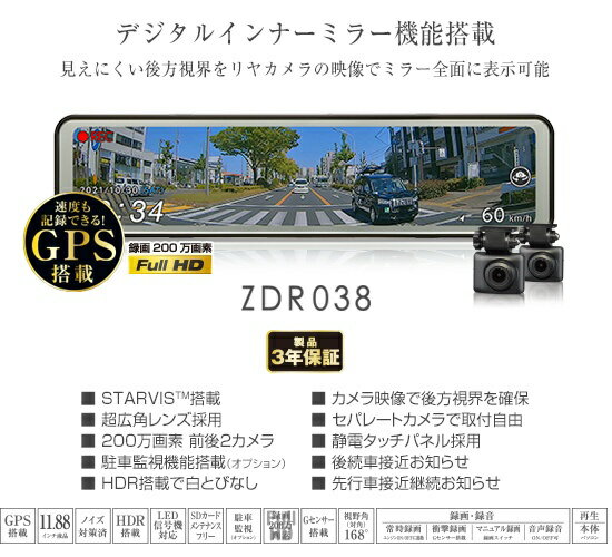 コムテック|COMTEC ドライブレコーダー ZDR038 [前後カメラ対応 /Full HD(200万画素) /セパレートミラー型]