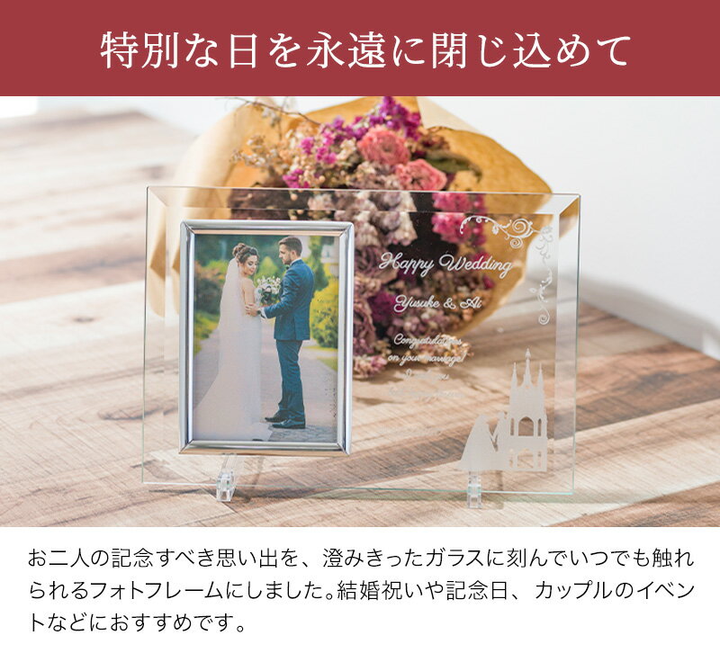 名入れ クリスタルフォトフレーム 写真立て ガラス フォトスタンド デザインC 結婚式 結婚祝い ウェディング ブライダル オーダーメイド ウェルカムスペース フォト婚 20代 30代 40代 新婚 カップル 夫婦 ギフト プレゼント 贈り物 無料ラッピング 無料メッセージカード 最短