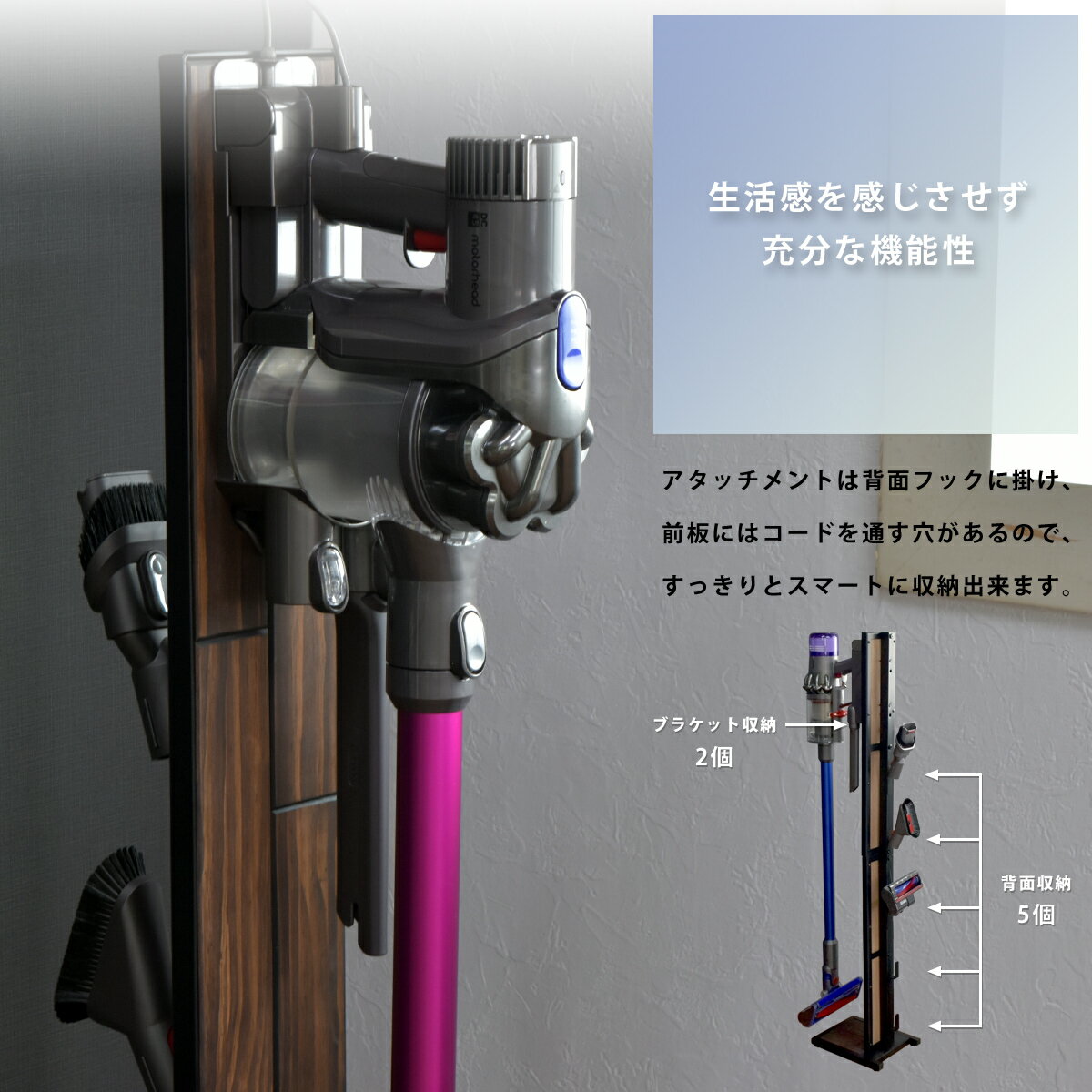 商品について: ダイソンコードレスクリーナーを、壁に穴を開けずに収納出来るスタンドです。