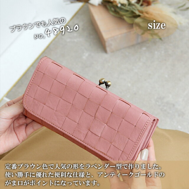 素材 牛革 サイズ・容量 幅:20cm 高さ:10cm マチ:2cm 内側:カード入れ×27 お札入れ×2 小銭入れ×1 カラー ラベンダー 生産国 インドネシア 特徴 【今年お財布としても縁起の良いカラーの ラベンダー色】 一枚ずつ手で染めては、天日で乾かす などの工程を何度も繰り返して仕上げた ヌメ革を細かくメッシュ状にし編み込んでいます。