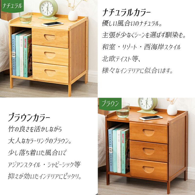 商品詳細 商品 天然竹無垢材サイドチェスト 製品詳細 最大サイズ 420×450×310mm カラー ナチュラルカラー ・ ブラウンカラー 引き出し三カ所付き 特徴 和風のテイストながらも、落ち着いた風合いと天然木スタイルで、北欧風・西海岸風等にピッタリのサイドテーブル。